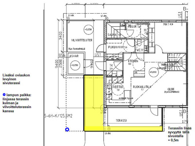 Niin, tuossa pari päivää sitten kertoilin vielä viimehetken muutoksista, mitä tehtiin asunnon ulkopuolelle. Päätettiin laajentaa terassia sillälailla, että etu- ja takaterassi menevät yhteen. Samalla syvennetään takaterassia hieman, niin mahtuu paremmin liikkumaan.