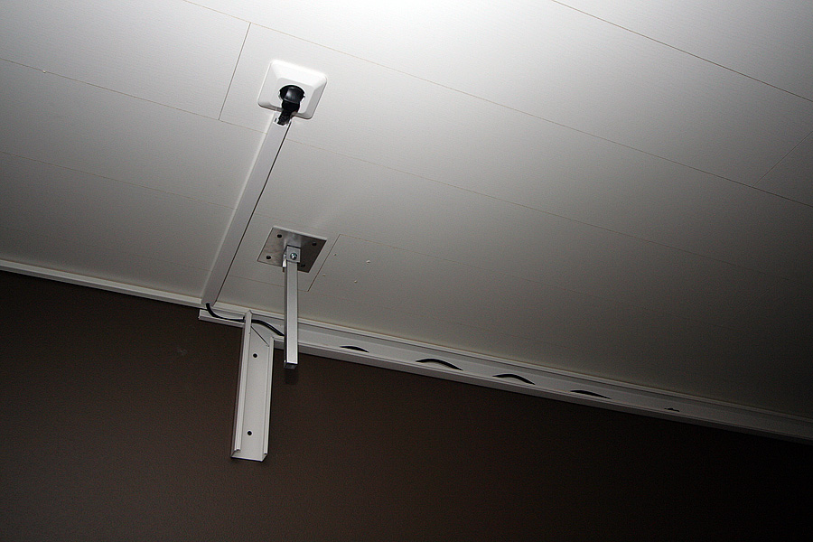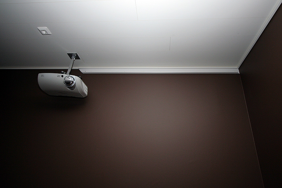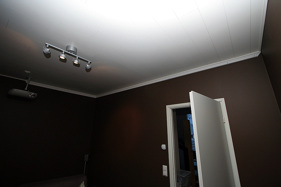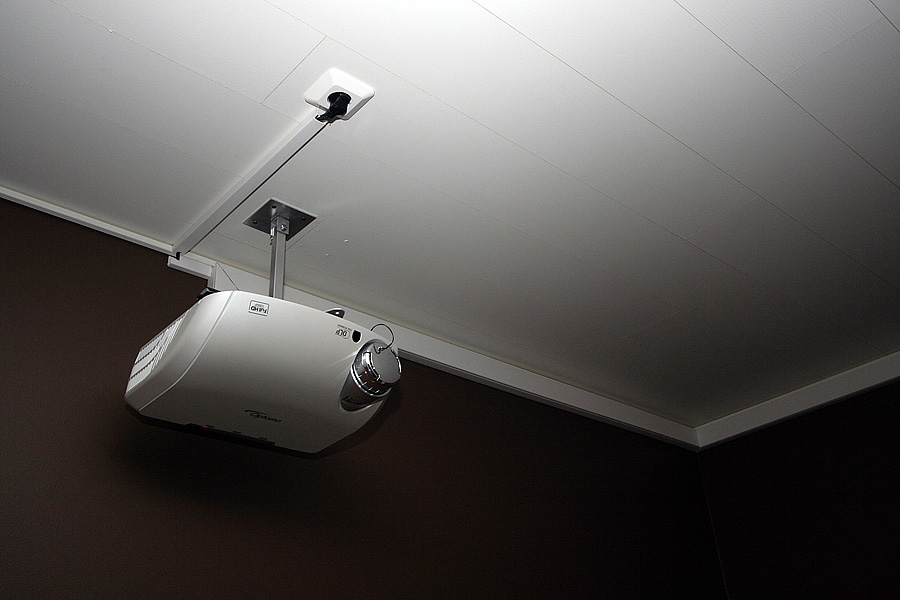Valmis. Uudessa projektorissa on toi linssi epäsymmetrisesti, joten sen takia telinettä joutui hieman siirtämään ja siitä noi ruuvinreiät katossa. Telineen voisi vielä maalata valkoiseksi, niin se häviäis hieman enempi tuonne kattoon. Muuten olen tyytyväinen. Kotelossa on tilaa vielä toiselle HDMI piuhalle, jos sille on tarvetta tulevaisuudessa.