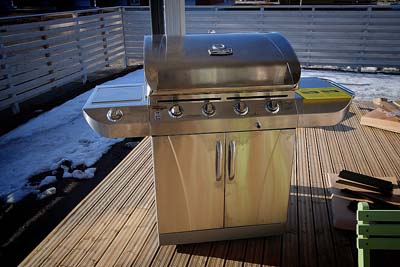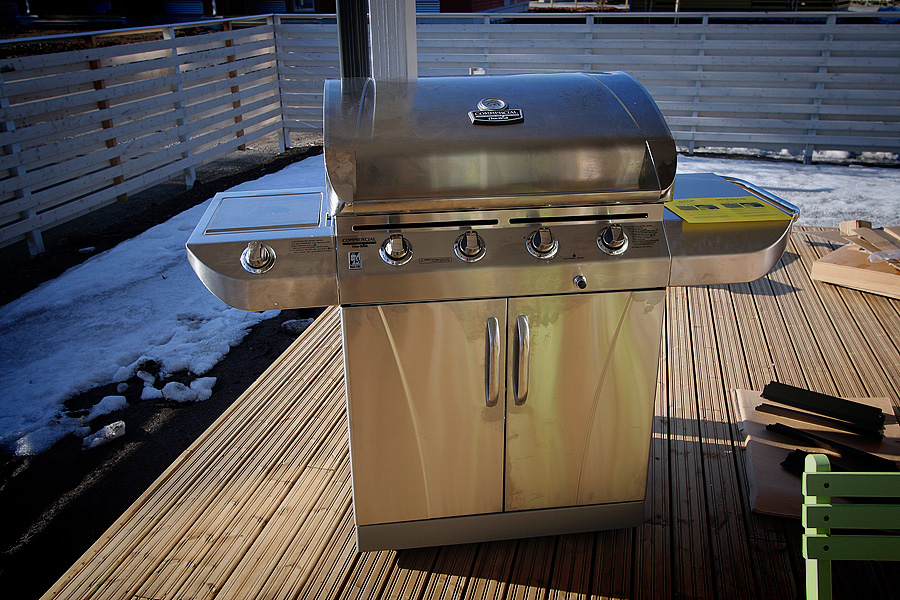Eilissäpäivänä päätettiin kaivaa grilli paketista ja ruveta kasaamaan se. Kasaamiseen meni semmoinen vajaa pari tuntia asennuskaljojen kanssa 🙂 Kaasupulloksi ostin sen pienemmän komposiittipullon, niin ei tarvi arvuutella paljon sitä kaasua on pullossa jäljellä. Meinas olla vähän hakusessa pullot. Monessa paikkaa myytiin ei-oota, mutta lopulta tuosta läheltä Shelliltä löytyi.