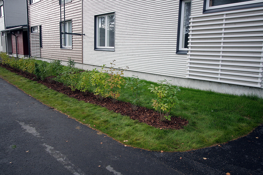 Taloyhtiö osti pensaiden juureen katetta, joten sen värkkäsin paikoilleen. Helpottaa huomattavasti leikkaamista, kun ei tarvi pujotella pensaiden välissä (ennenkuin tuosta aita muodostuu). Multaa on 15 kuutiota tuossa talon vieressä, mutta vielä en ole keksinyt sille käyttötarvetta. Tosin se jaetaan asuntojen kesken, mutta jää siitä silti noin reilu puolikuutiota meille 🙂