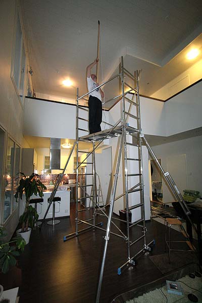 Tänään saatiin taloyhtiölle telineet, millä pääsi asenteleen valaisinta ruokapöydälle. Pakettiin kuului myös jatkopalat, jotka olisi lisännyt korkeutta vielä parimetriä. Mutta ne ei enää mahtunutkaan, joten joutui kikkailemaan McGyver tyylillä lampun kattoon tuollaista listaa ja keittiöjakkaraa hyväksi käyttäen 🙂 Pitäisköhän patentoida tuo keppi, millä saa asennettua koukut kattoon? 😉 Jatkopalasesta pitänee ottaa noin puolimetriä pois, niin seuraavalla kerralla pääsee sit reilu pari metriä korkeammalle, eikä tarvi kepeillä kikkailla.
