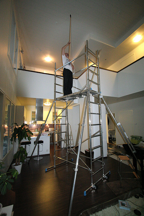 Tänään saatiin taloyhtiölle telineet, millä pääsi asenteleen valaisinta ruokapöydälle. Pakettiin kuului myös jatkopalat, jotka olisi lisännyt korkeutta vielä parimetriä. Mutta ne ei enää mahtunutkaan, joten joutui kikkailemaan McGyver tyylillä lampun kattoon tuollaista listaa ja keittiöjakkaraa hyväksi käyttäen 🙂 Pitäisköhän patentoida tuo keppi, millä saa asennettua koukut kattoon? 😉 Jatkopalasesta pitänee ottaa noin puolimetriä pois, niin seuraavalla kerralla pääsee sit reilu pari metriä korkeammalle, eikä tarvi kepeillä kikkailla.
