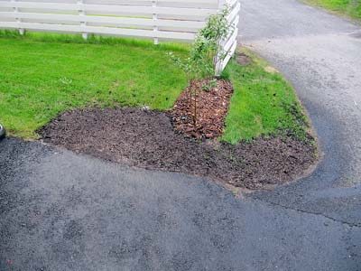 Palanen ja sorat kaivettu pois. Vähänlaisesti on multaa tuossa asvaltin vieressä, mutta eiköhän se lannoituksen avulla kasva.