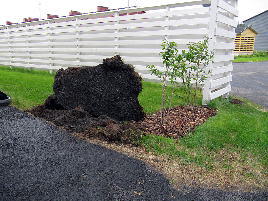 Palanen ja sorat kaivettu pois. Vähänlaisesti on multaa tuossa asvaltin vieressä, mutta eiköhän se lannoituksen avulla kasva.