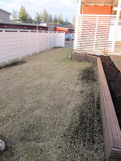 Samalla paikkailin muutamaa kohtaa, missä nurmikko ei ihan täysillä kasva. Nyt voi alkaa odottelemaan ensimmäistä leikkausta.