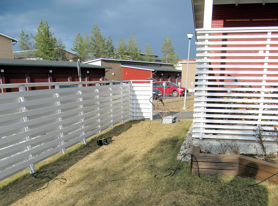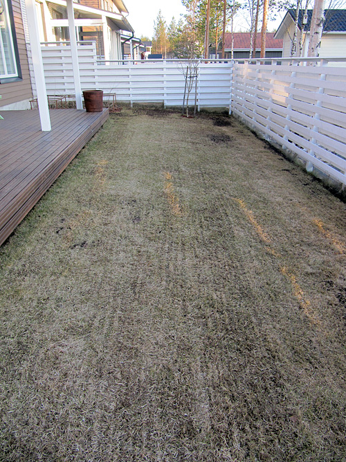 Samalla paikkailin muutamaa kohtaa, missä nurmikko ei ihan täysillä kasva. Nyt voi alkaa odottelemaan ensimmäistä leikkausta.