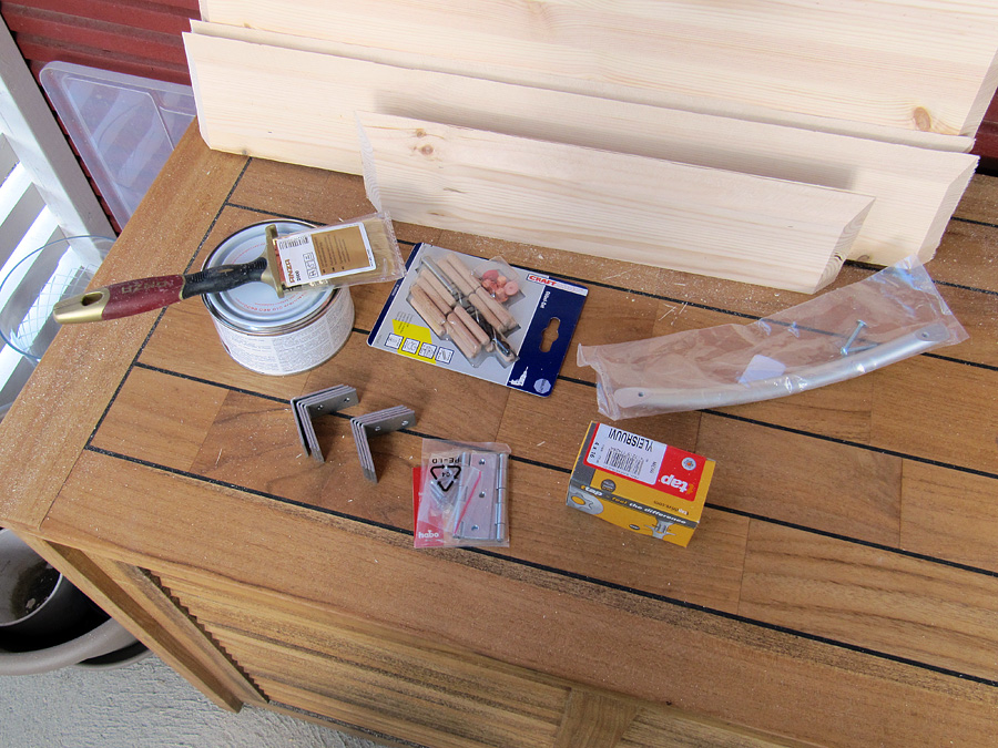 Pohjanlevyn sahaus epäonnistui, kun tein mittavirheen viimeisessä sahauksessa. Sahasin sentin liihan lyhyeksi levyn ja yhtään ylimääräistä puuta ei ollut. Joten pitää vielä kaupasta hakea yksi levy, sahata se, jonka jälkeen voikin opetella puutappien käytön ja kasata laatikon. Sen jälkeen laatikon petsaus, saranat ja kahva paikoilleen ja arkku olisi aikalailla valmis. Huomiseksi on luvattu vesisadetta, joten saapa nähdä pääseekö vielä huomenna jatkamaan projektia.