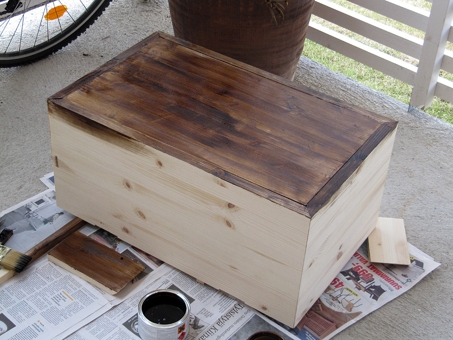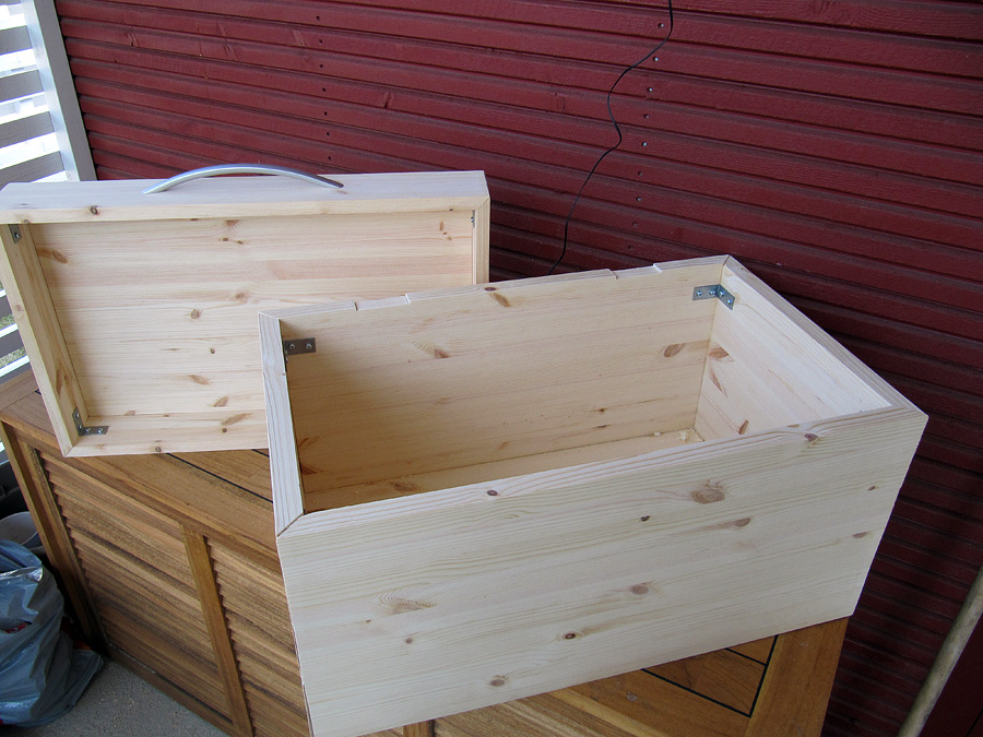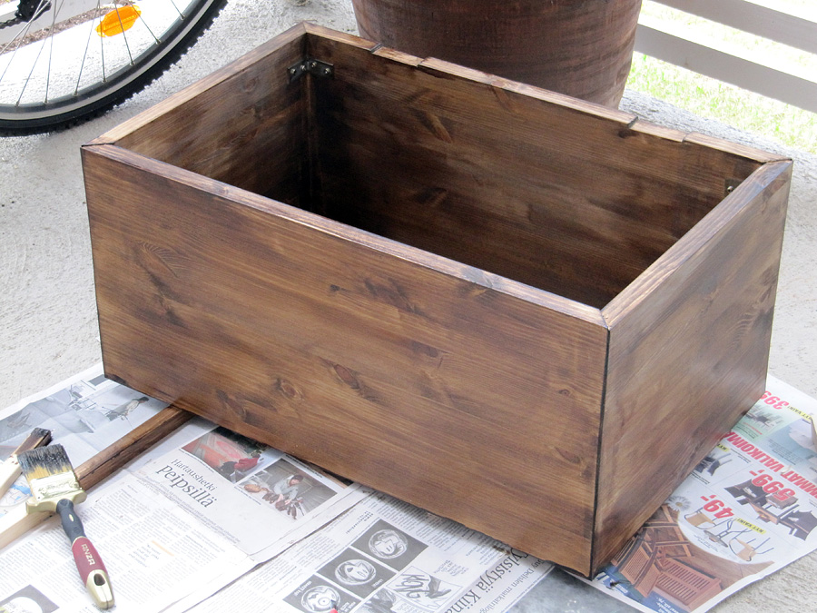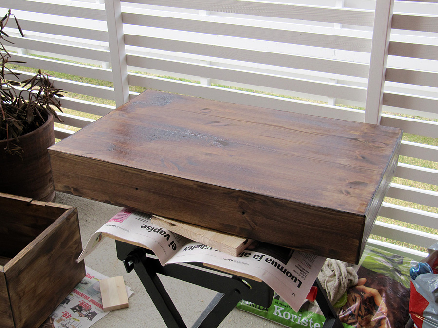 Tänään tehtiin pihalle toinen projekti (mistä kohta kerron lisää), niin arkku sai rauhassa kuivaa vielä tämän päivän. Huomenna varmaankin ruuvailen saranat paikoilleen ja arkku rupeaa olemaan valmis.