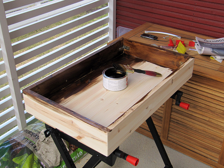 Pintaan päätettiin laittaa tummaa petsilakkaa ja aloitin pohjasta, että näki tarviiko petsiä ohentaa. Pohjan jälkeen ohensin petsiä hieman, niin että sitä oli helpompi levittää.
