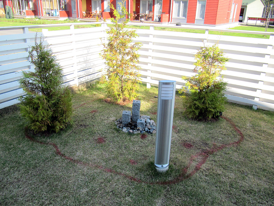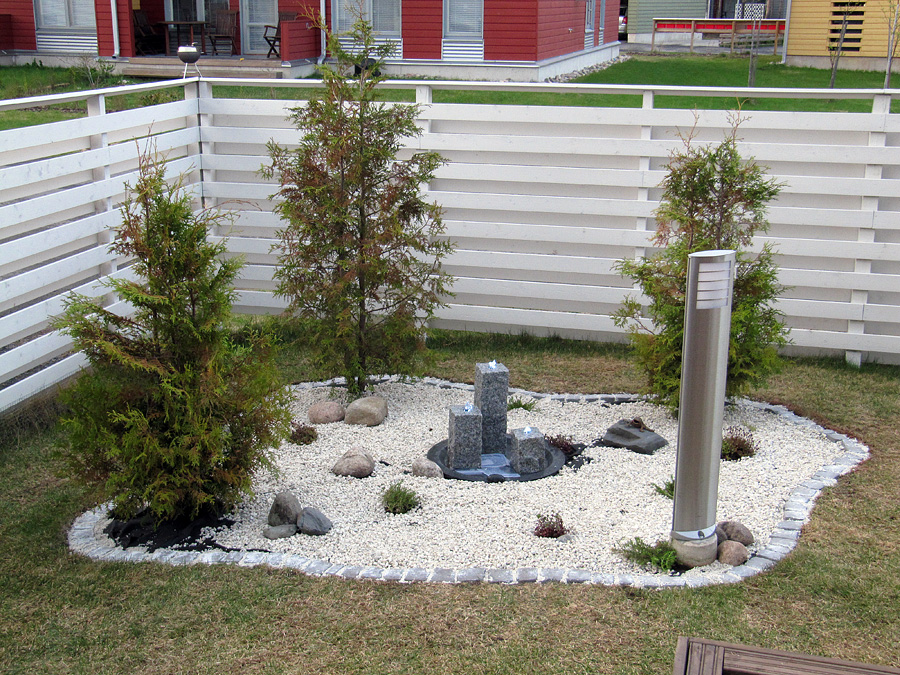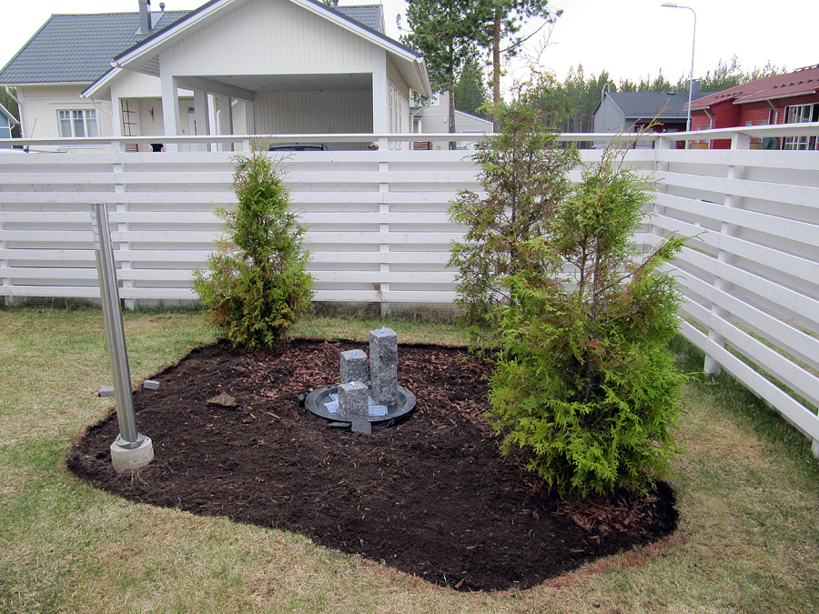Hieman jäi vajaaksi tuon valkoisen kiven laittaminen, koska kivet loppui kesken. Eli joutuu huomenna hakemaan pari säkillistä lisää. Suihkulähde on tarkoitus myös saada umpeen. Ja reunakivet pitää vielä pestä puhtaaksi asennushiekasta.