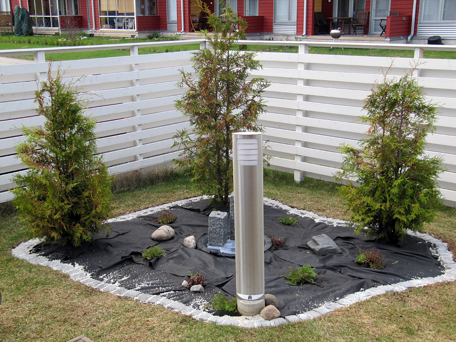 Reunakivet laitettu ja saumattu valkoisella hiekalla. Kangas myös laitettu, ettei nurmikko leviä tuonne kivien sekaan. Samoten jokunen kasvi istutettu, jotka varmaankin leviää tuosta vielä.
