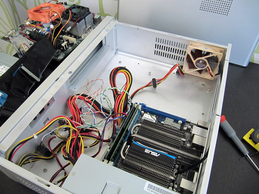 HTPC osat tulivat toukokuun loppupuolella ja yhtenä iltana kasasin koneen valmiiksi ja asentelin sitä aina kun vain ehdin. Emolevyt on hieman pienempiä nykyään, joten koteloon jäi aika runsaasti ilmaa ympärille. Lisäsin yhden kotelotuulettimen, että ilma vaihtuisi jonkun verran, koska prosessorissa ei itsessään ole tuuletinta ollenkaan. Pari päivää sitten laittelin sen tuonne TV-tasoon, joten pitää seurailla lämpöjä, että miten ne käyttäytyy.