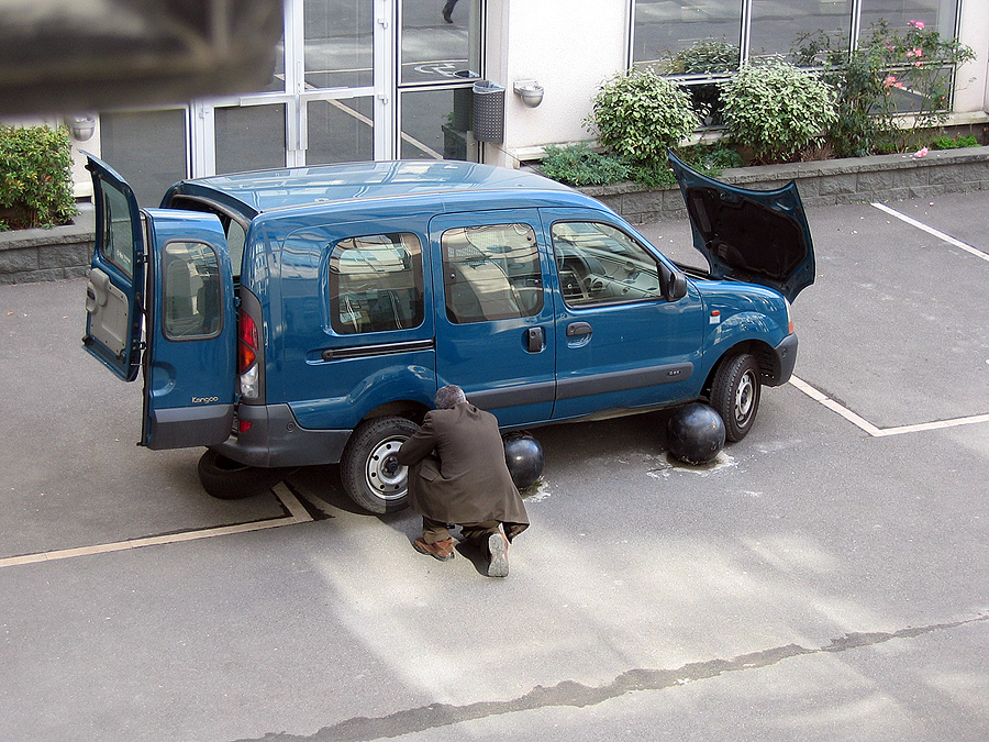 Tässä vielä peruutuksen taidonnäyte. Oli joku jylppy peruutellut tuollaisten esteiden päälle. Siinä ne värkkäsi pienen tovin, ennenkuin saivat auton nostettua pois.