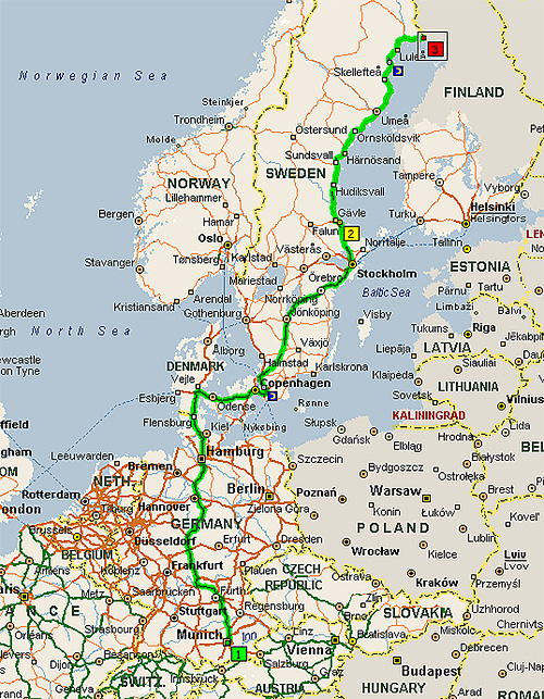 Tänään iltasella kulutin taas aikaa Roadtrip Munich – Oulu 2006 suunnitteluun. Tuossa katellut erilaisia vaihtoehtoja ja laskenut kuinka kauan aikaa saa palamaan tien päälle. Lentoliput laitoin tilaukseen jo tänään ja tarkoituksena on tulla Muncheniin edellisenä päivänä, kun saan auton. Hotelliin check-in ja sit kierteleen vaikka Marienplatzille, jos vaikka olis jalkapallokrääsää edullisesti myytävänä.