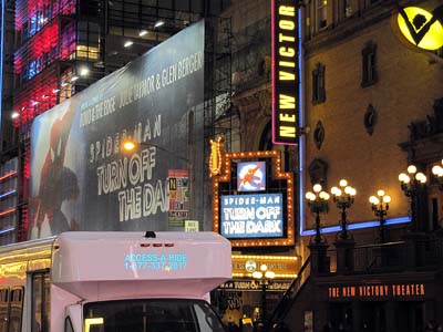 Toisena iltana käytiin katsomassa broadwaylla Spider-Man – Turn Off the Dark -näytös. Vauhtia ja vaarallisia tilanteita siinä riitti, kun kaverit liisivät vaijereiden varassa ympäri teatterisalia.