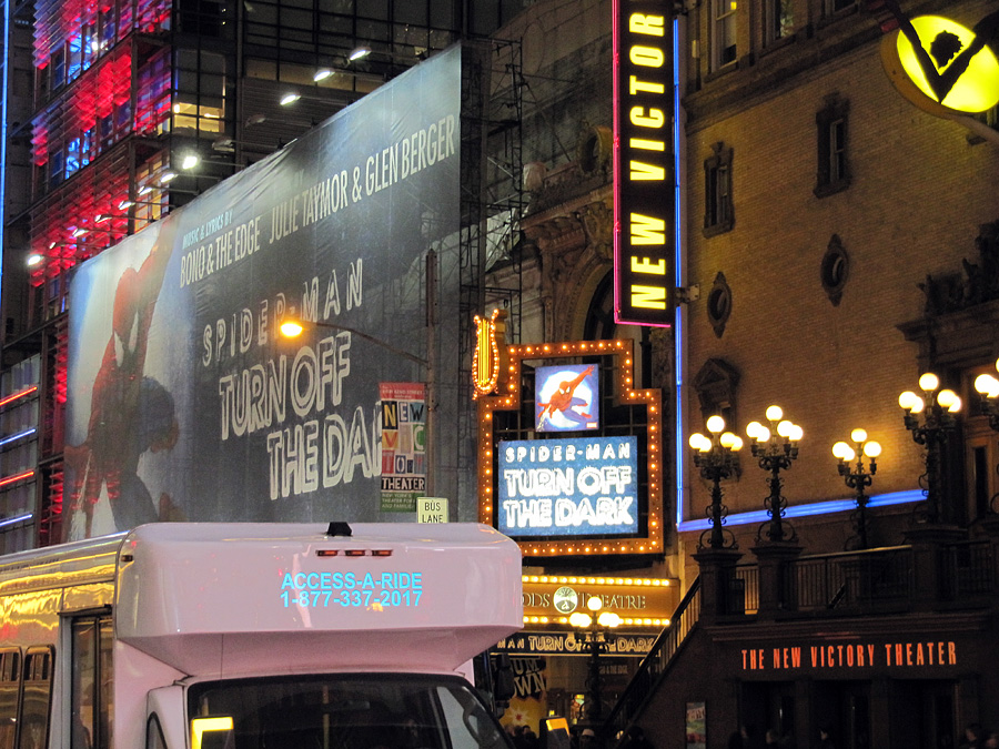 Toisena iltana käytiin katsomassa broadwaylla Spider-Man – Turn Off the Dark -näytös. Vauhtia ja vaarallisia tilanteita siinä riitti, kun kaverit liisivät vaijereiden varassa ympäri teatterisalia.